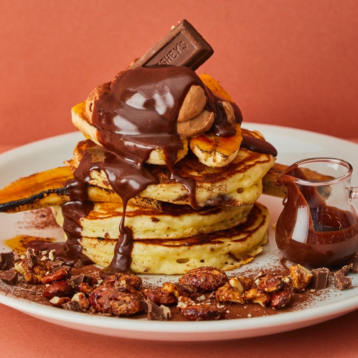HERSHEY'Sのミルクチョコレートをたっぷり使用した、チョコ好きにはたまらないプレミアムなチョコバナナパンケーキ。