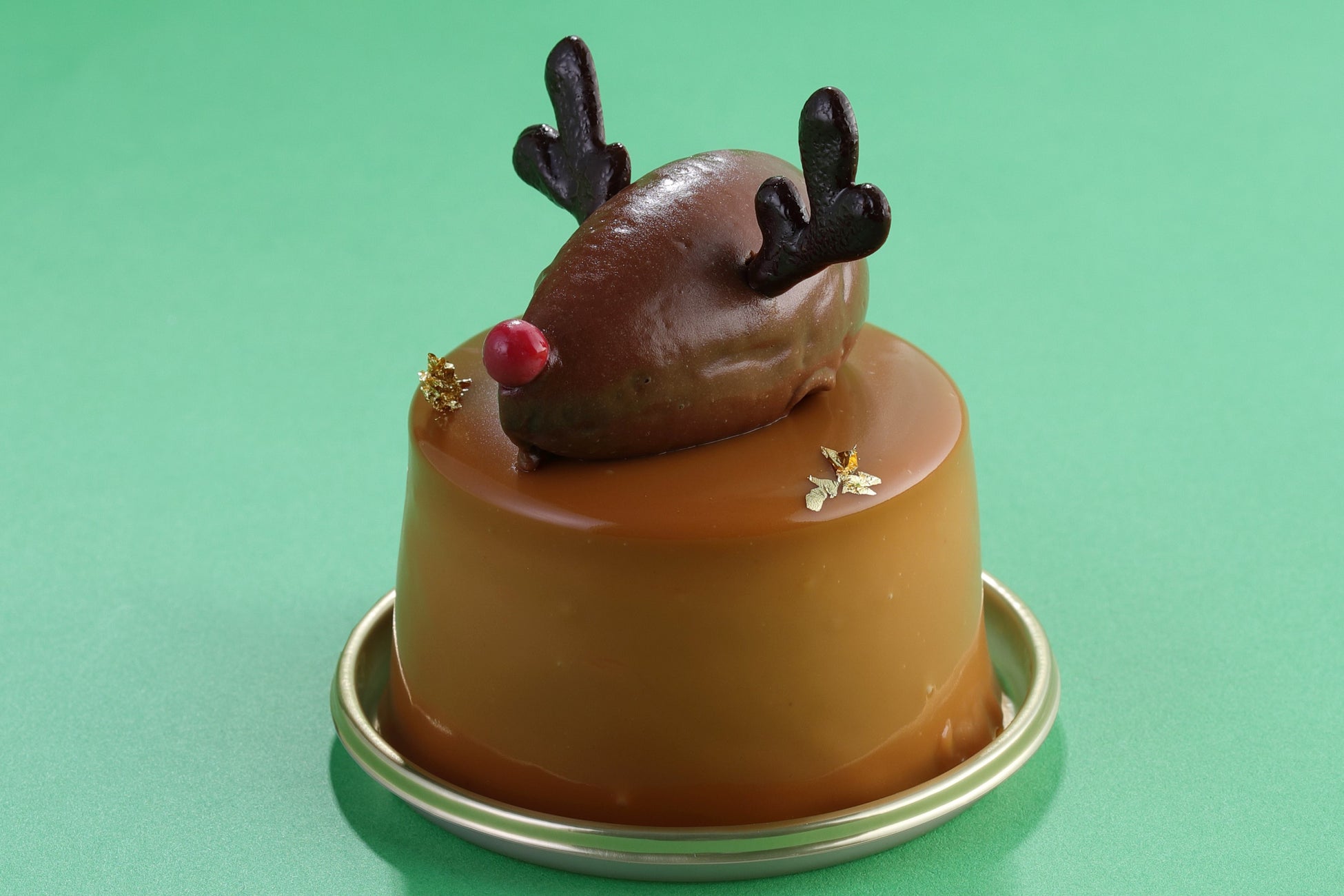 チョコレートクリームでトナカイを立体的に表現したムースケーキ。洋梨のソテーをやさしい甘さの洋梨ムースとほろ苦いキャラメルムースで包み込みました。