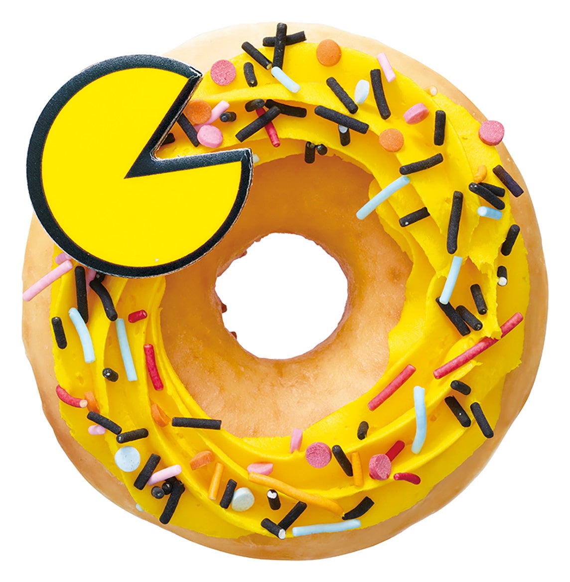 見ても食べても楽しい!遊び心あふれる『パックマン』45周年コラボドーナツ。リングドーナツにほんのりカスタード風味のクリームを絞り、ゴーストたちのカラーをイメージしたカラフルなスプリンクルをトッピング。パックマンのモナカも乗せました。