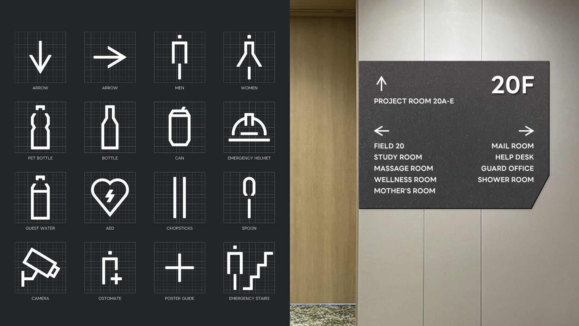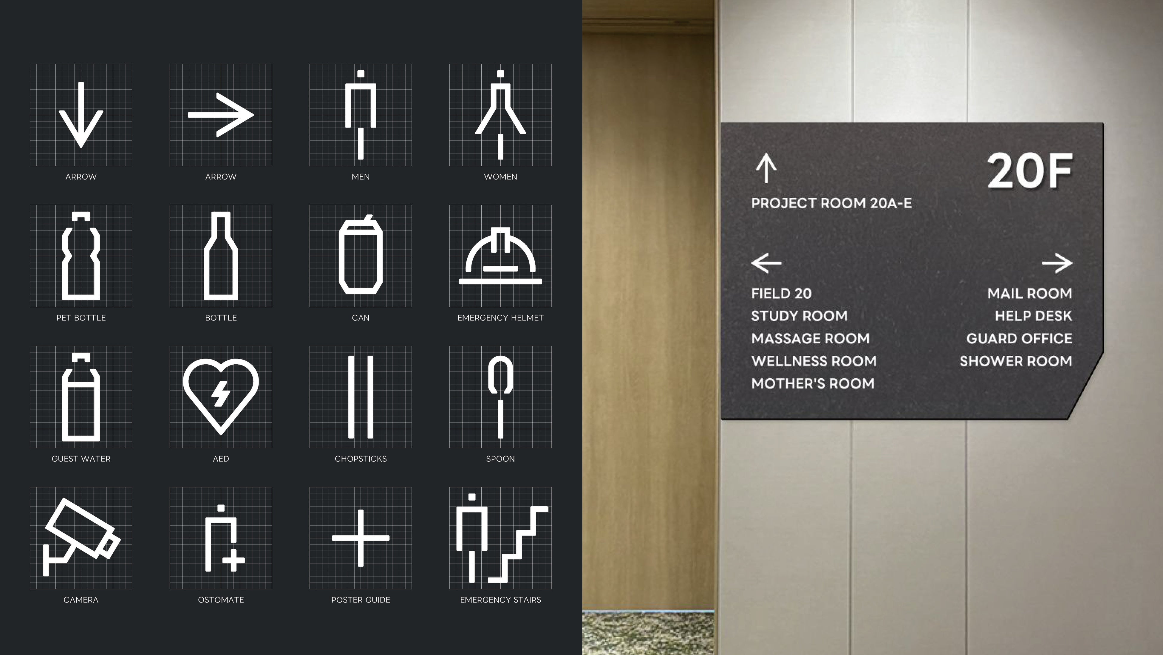 オフィス全体のデザインには、LINEヤフーのブランド要素や価値観を取り入れています。コーポレートロゴに用いられている「62度」の角度(イノベーションエッジ)※1をサインや空間の細部に反映するなど、ブランドの考え方を空間全体に落とし込みました。また、案内サインや空間設計、素材の選定においては、機能性に加え、親しみやすさやわかりやすさにも配慮しています。