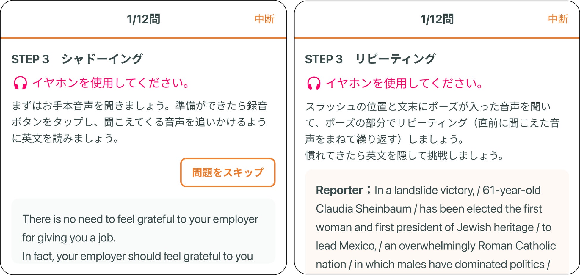 リスニング学習を中心として、シャドーイング、ディクテーション、リピーティング、同時通訳練習などのアウトプット練習も豊富に用意されているので、「聞く」「読む」「話す」「書く」の4技能を、網羅的かつ効率的に習得できます。また、英語のアウトプット練習はすべて音声判定機能で採点されるので、上達を実感しながらのトレーニングが可能です。