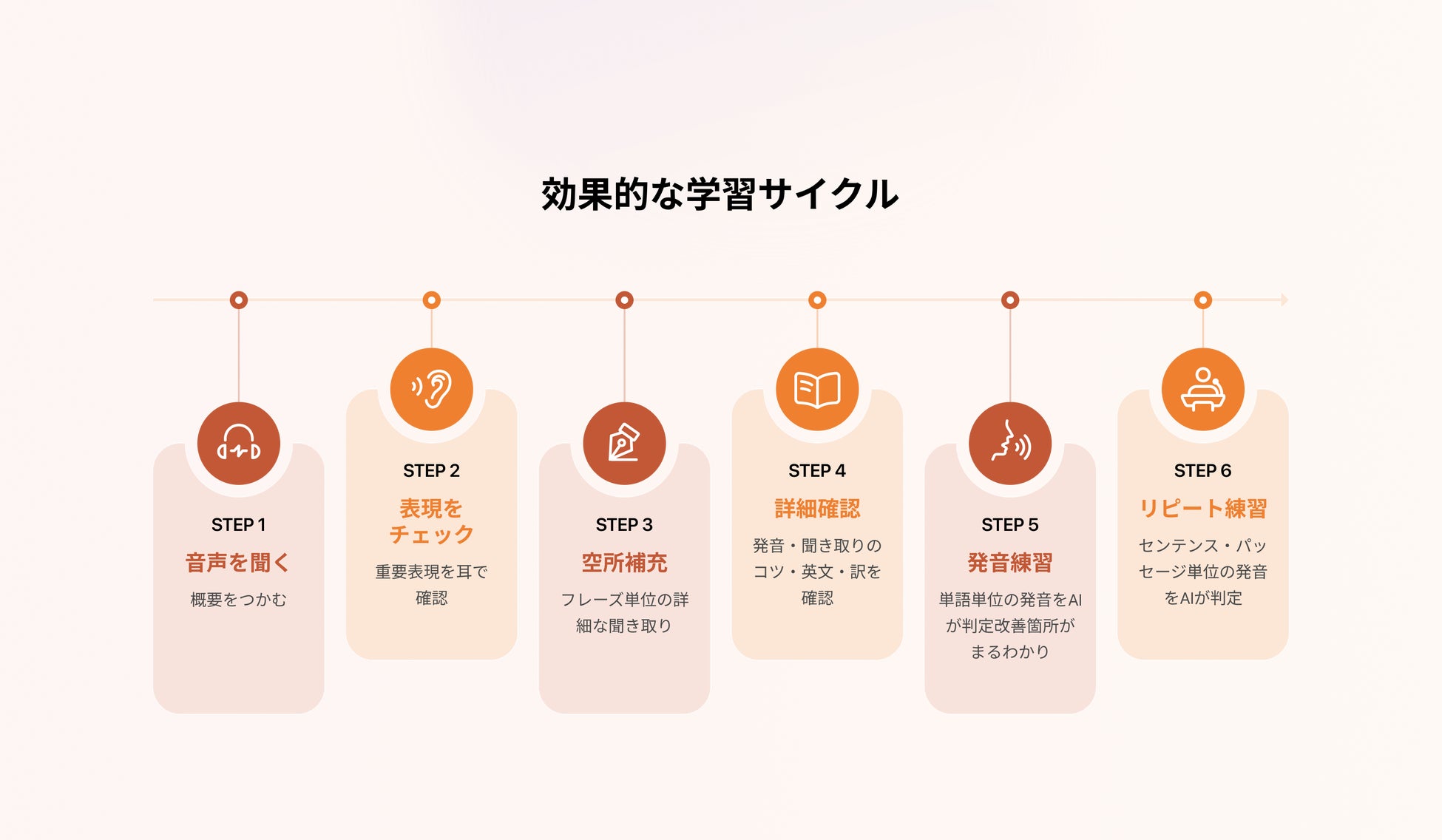 ただ漠然と英語を聞くのではなく、細かい具体的な目標を一つ一つクリアするSTEP学習で進めていくので、全体から細部まで、効率的に英語が聞き取れるようになっていきます。