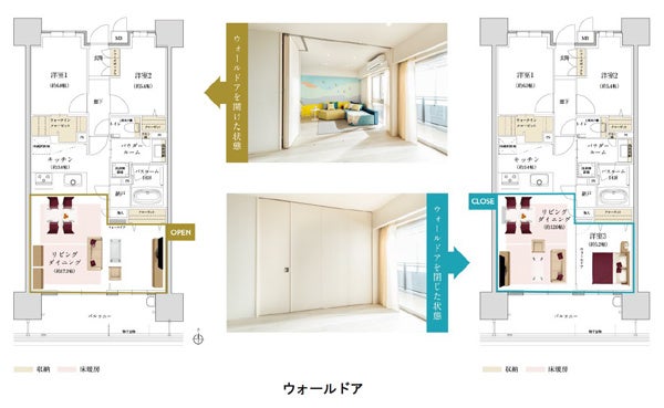 さらに、入居後の家族数の変化や生活環境の変化にも対応できるよう、間取りに可変性を持たせる「ウォールドア」を採用しました。(※5)開けた状態ではリビングを広く確保し、閉めると寝室や書斎として利用できるなど、ライフステージや生活シーンに合わせた空間利用が可能になります。