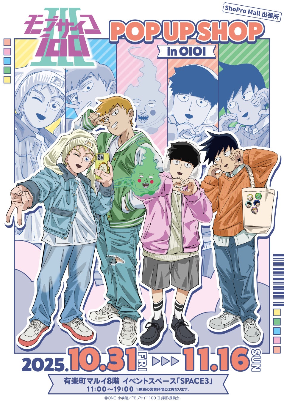また、有楽町マルイ8階イベントスペースにて、「『モブサイコ100 Ⅲ』POP UP SHOP in OIOI ShoPro Mall出張所」を開催。キャラクターの等身大パネルや場面写等の展示も予定しています。