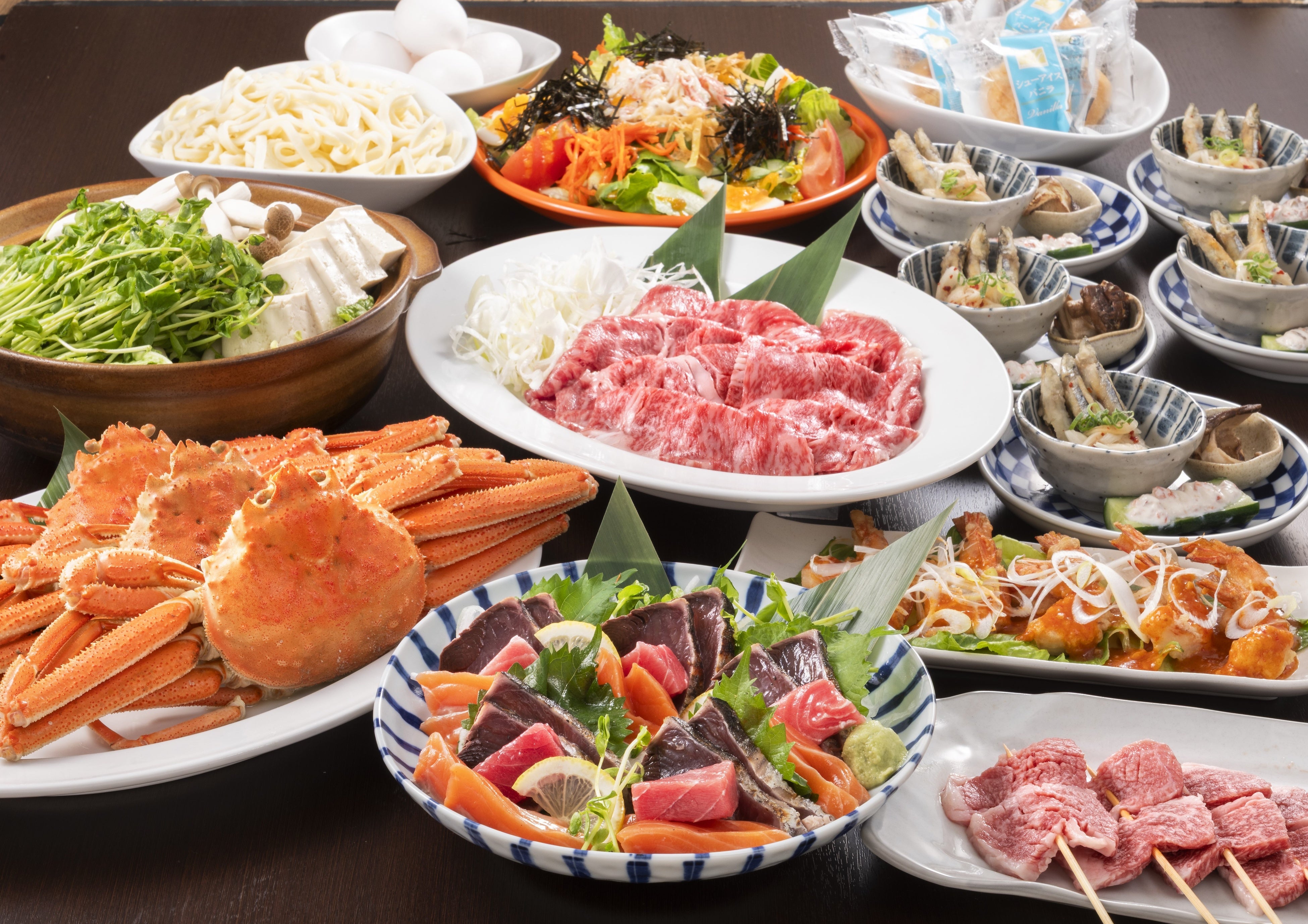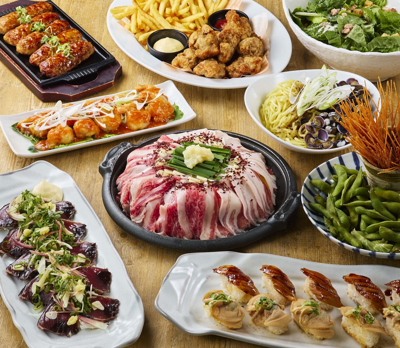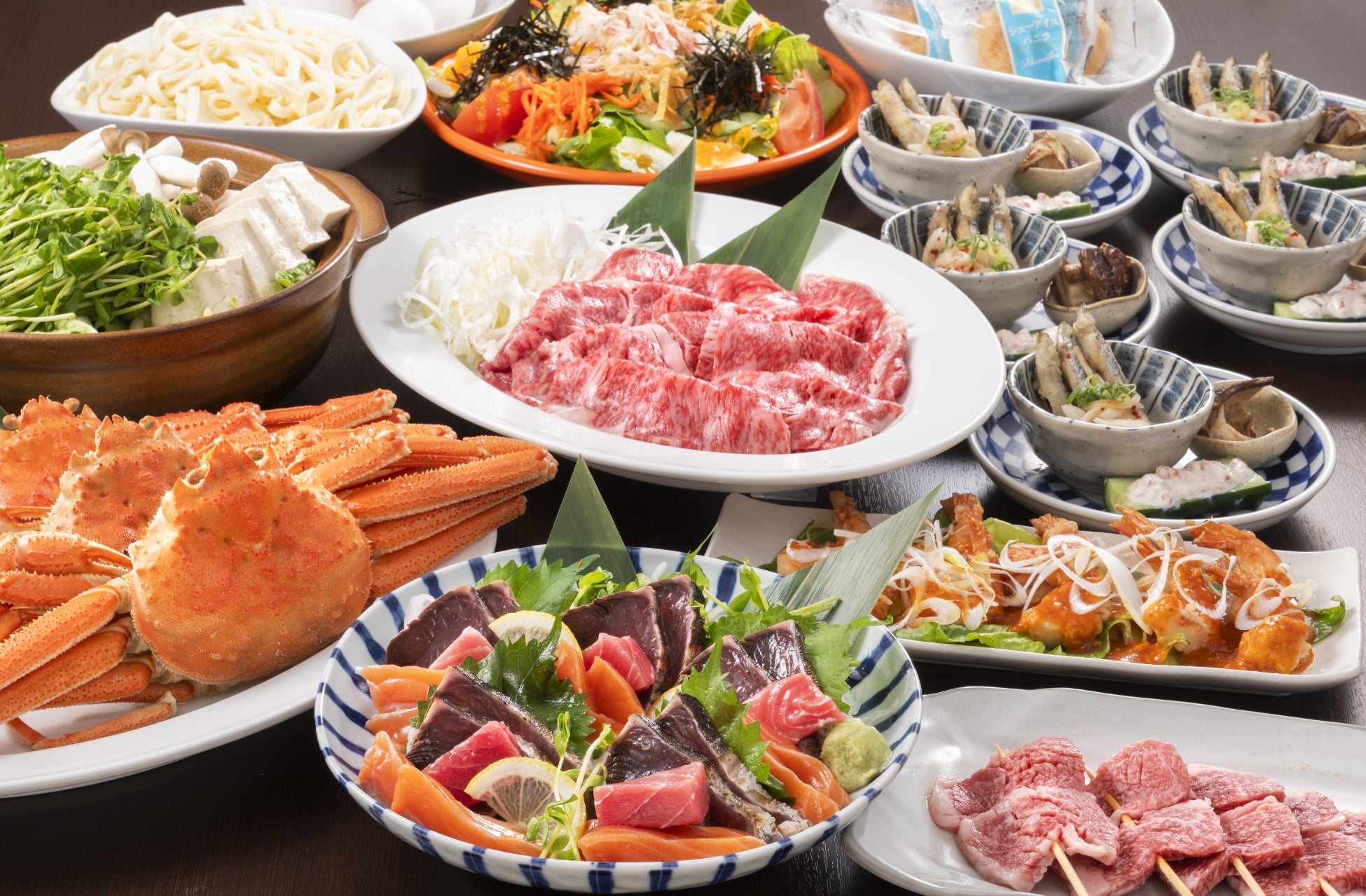 今回新しく加わった、「春のご馳走コース」(150分飲み放題付き税込4,500円)は「日本三大和牛と霧島黒豚の旨貝出汁陶板」をご用意。日本三大和牛の「近江牛」(2月から3月提供予定)「松坂牛」「神戸牛」(4月から6月予定)を、霧島黒豚と共に味わっていただける商品です。和牛ならではのコクと旨味、歯切れの良さと脂の甘味が特徴の黒豚に、特製の貝出汁をかけて召し上がっていただきます。春らしいカツオの土佐盛り、煮はまぐりと穴子の寿司盛合せなど季節の食材をふんだんに取り入れたコースです。