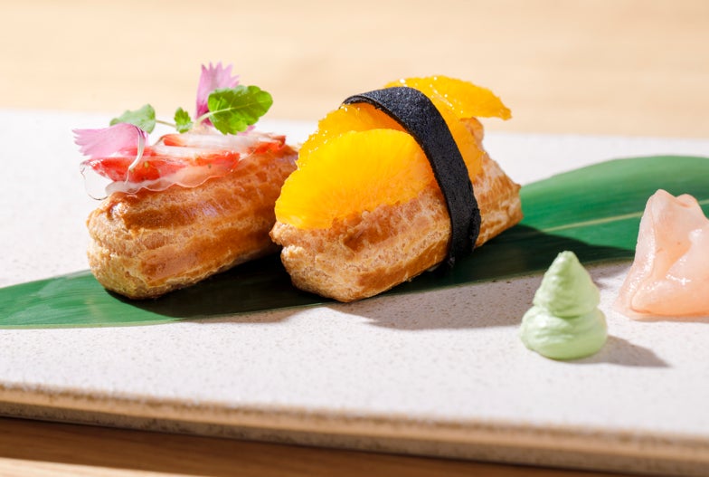 「和のアフタヌーンティー withクルミッ子」の開催期間中、アラカルトデザートとして、クルミッ子のキャラメルソースを使用した「お菓子の創作寿司」をご用意いたします。寿司をイメージしたデザートの「お菓子の創作寿司」は、シュー生地に季節のフルーツをあわせ、クルミッ子のキャラメルソースの甘さの中に感じるほんのりとした苦みと、サワークリームの酸味を合わせたユニークなデザートです。喫水線の営業時間中、ランチ、アフタヌーンティー、ディナーの時間帯ともに、アラカルトデザートとしてお楽しみいただけます。また、アフタヌーンティーで提供するクルミッ子のキャラメルソースを使用したドリンクもお楽しみいただけます。