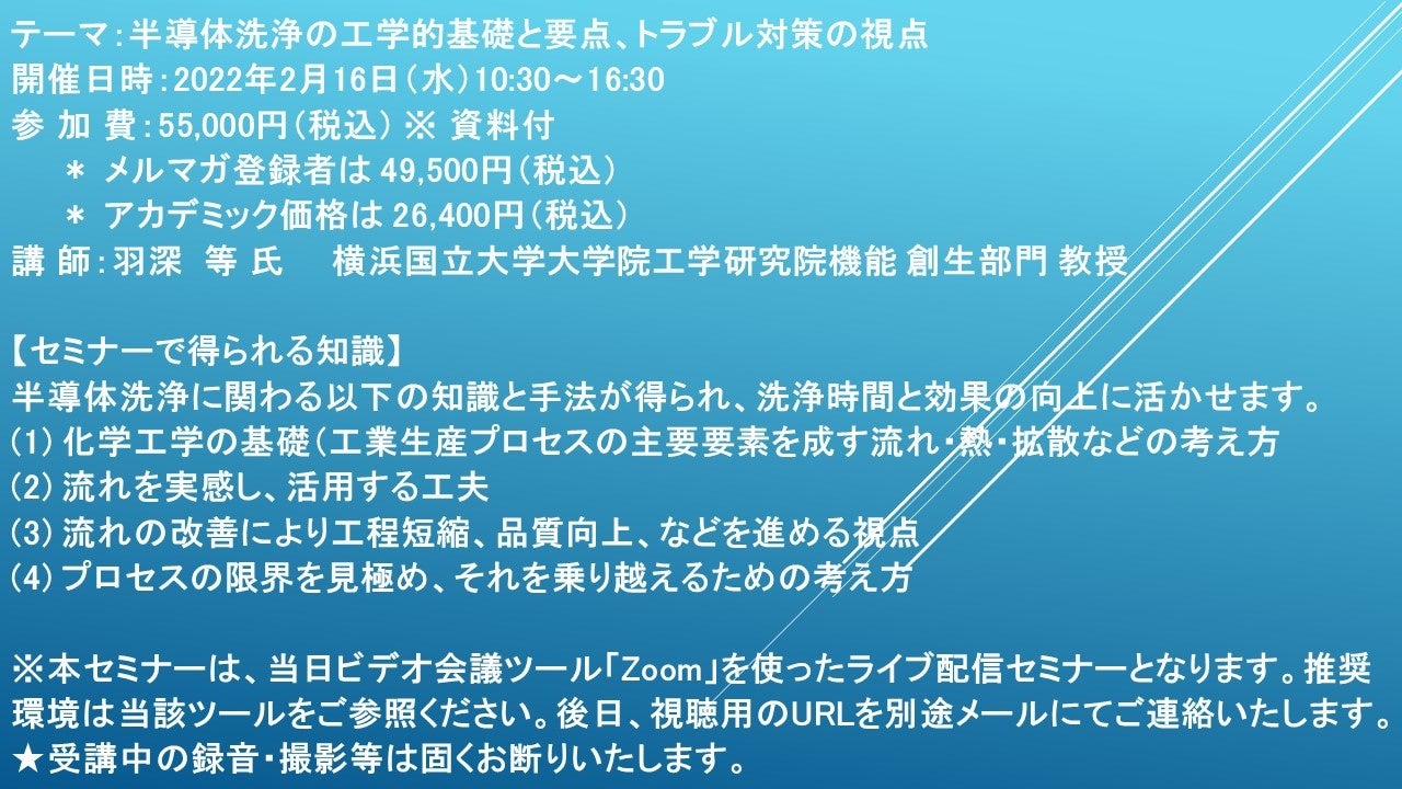 先端技術情報や市場情報を提供している(株)シーエムシー・リサーチ(千代田区神田錦町: https://cmcre.com/ )では、 各種材料・化学品などの市場動向・技術動向のセミナーや書籍発行を行っておりますが、 このたび「半導体洗浄の工学的基礎と要点、トラブル対策の視点」と題するセミナーを、 講師に羽深 等 氏 横浜国立大学大学院工学研究院機能 創生部門 教授)をお迎えし、2022年2月16日(水)10:30より、 ZOOMを利用したライブ配信で開催いたします。 受講料は、 一般:55,000円(税込)、 弊社メルマガ会員:49,500円(税込)、 アカデミック価格は26,400円(税込)となっております(資料付)。