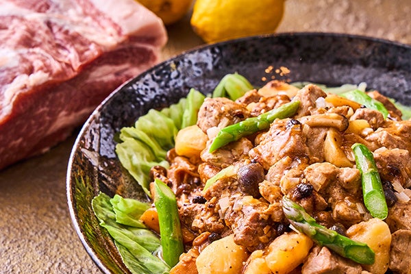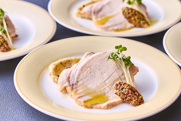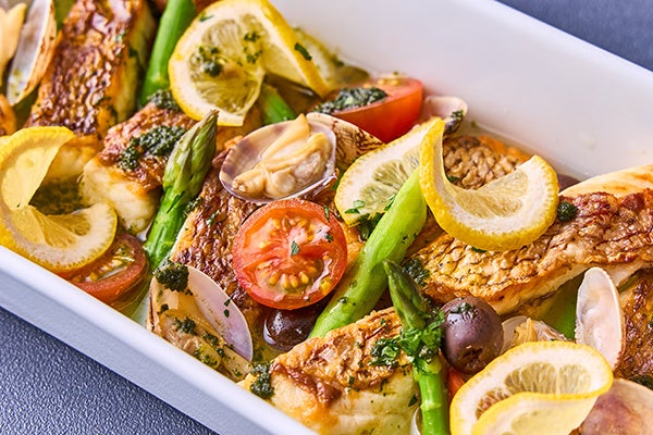 柔らかな肉質の愛媛県産「松山どり」をソテーし、酸味がきいてさっぱりとした赤ワインビネガーソースでご提供する「愛媛県産松山どりのソテー ヴァンルージュビネガーソース」や、バター、醤油、胡椒などで炒めたかしわ(鶏肉)をご飯にのせた香川県のB級グルメ「かしわバター丼」、愛媛の郷土料理「じゃこ天」を独自にアレンジした特産品で、サクッ・ジュワッとした食感がたまらない「じゃこカツ」は、やみつきになること間違いなしの一品です。この時期が旬の愛媛県産真鯛を使用した色鮮やかなアクアパッツァに、しっかりとした赤身の旨み、さっぱりとした豚の甘みが楽しめる香川県のブランド豚肉「オリーブ豚のプランチャ」もご堪能ください。食物繊維が豊富で、プチプチした食感にふわっとした軽い口当たり、滑らかな舌触りが特徴の愛媛県産の「押しはだか麦」は、リゾットにしてご提供します。