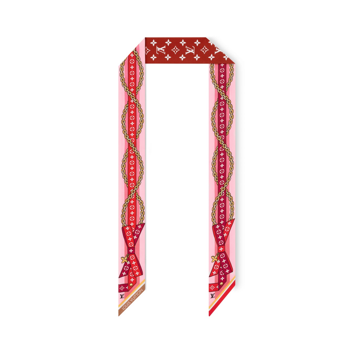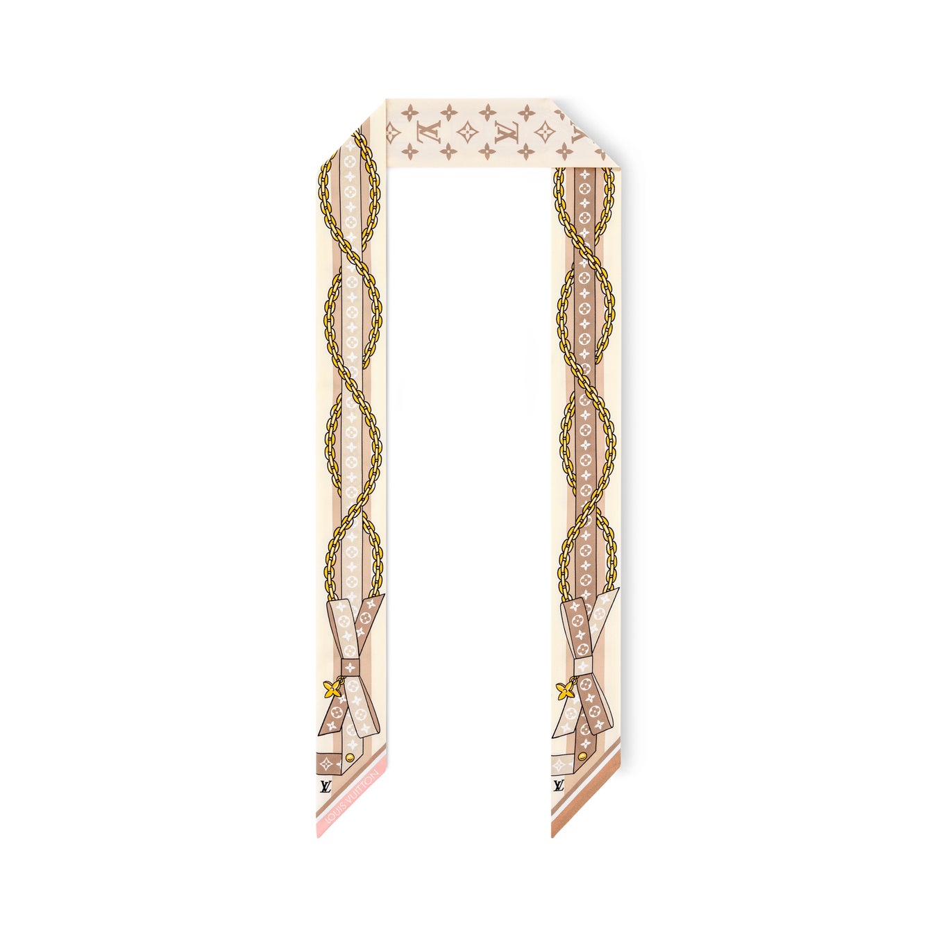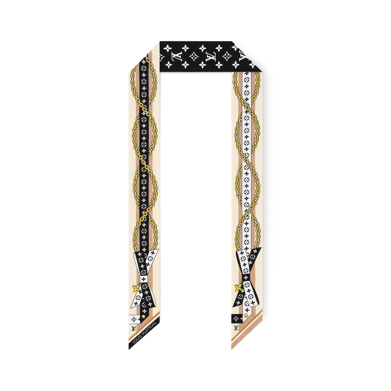 「バンドーBB·LV ボウ」は、アーティスティックなプリントには、細いリンクチェーンと絡み合いながらエレガントに結ばれた、モノグラム·フラワーのリボンが描かれています。首元や手首に巻いたり、バッグのハンドルに彩りを添えるのにぴったりの、あらゆる装いに上品なアクセントを加えるカラフルなアクセサリーです。