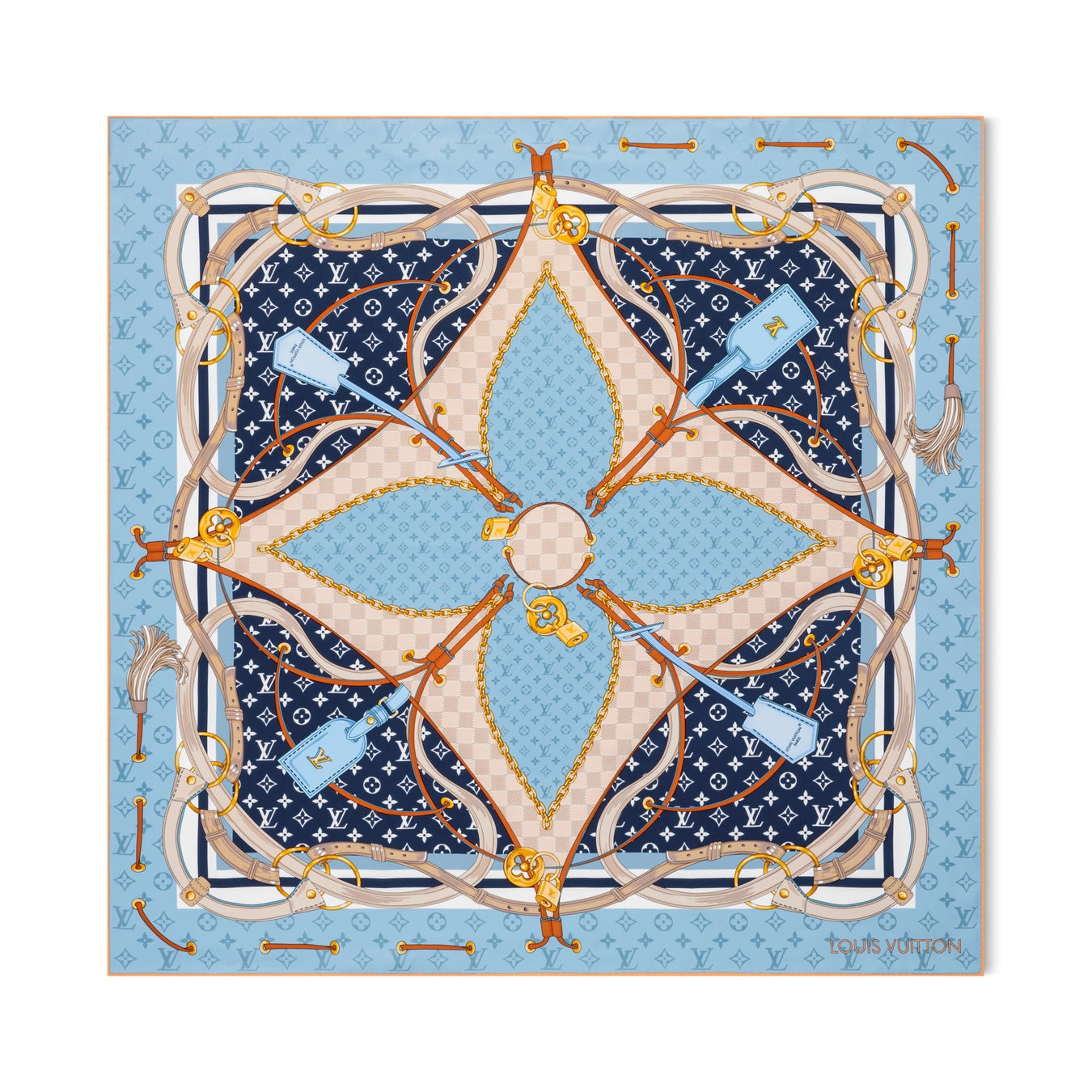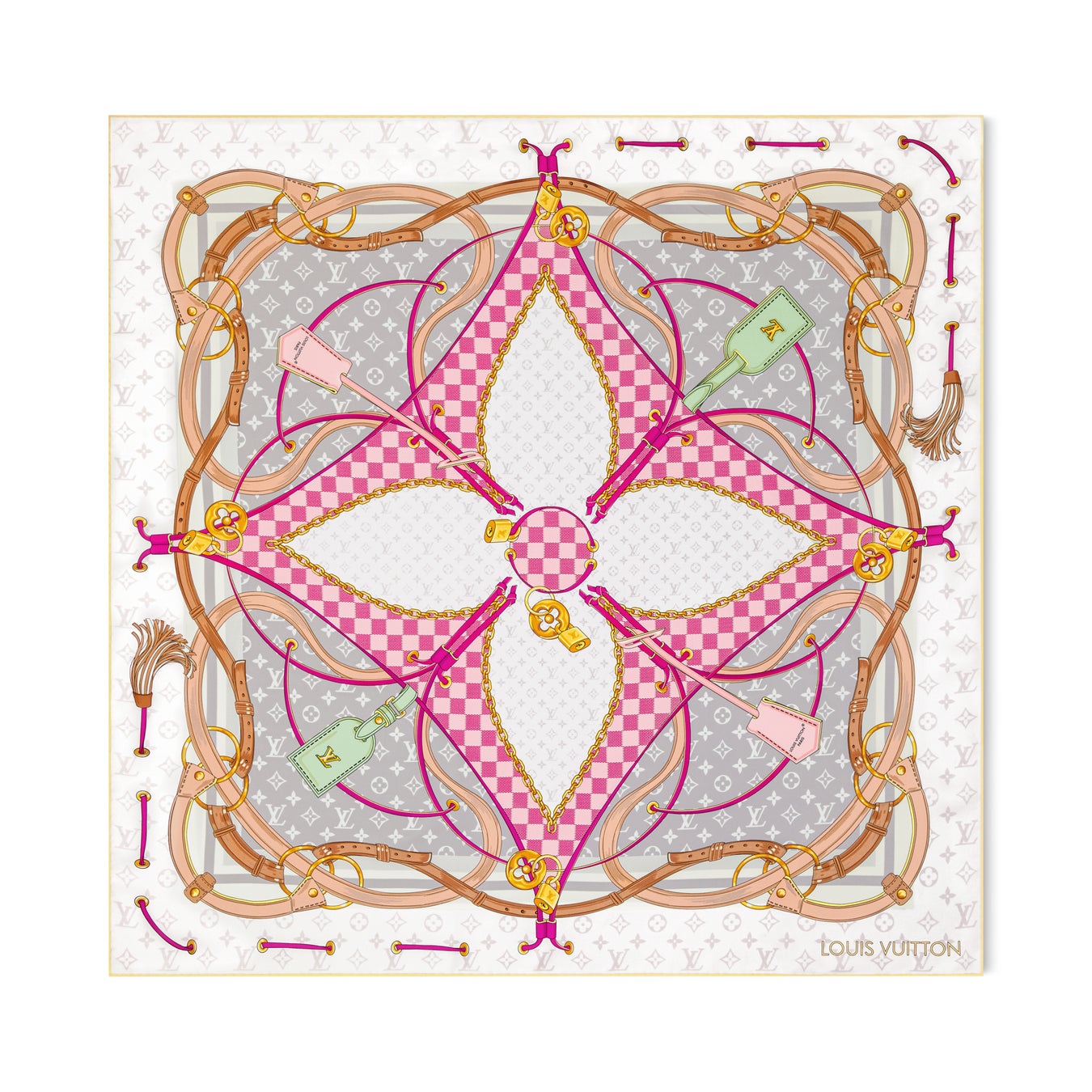 大胆かつ洗練されたシグネチャー·モチーフがステートメントを放つ、エレガントな新作「カレ90·フラワーアンドストラップス」。モノグラム·フラワーやストラップ、パドロック(錠前)やネームタグなど、ルイ·ヴィトンのアイコンの数々をアップビートな雰囲気で組み合わせたフレッシュでモダンなデザインを、ラグジュアリーなシルクにスクリーン·プリントで施しました。モノグラムとダミエ·パターンを散りばめた背景がメゾンならではの個性を添えます。