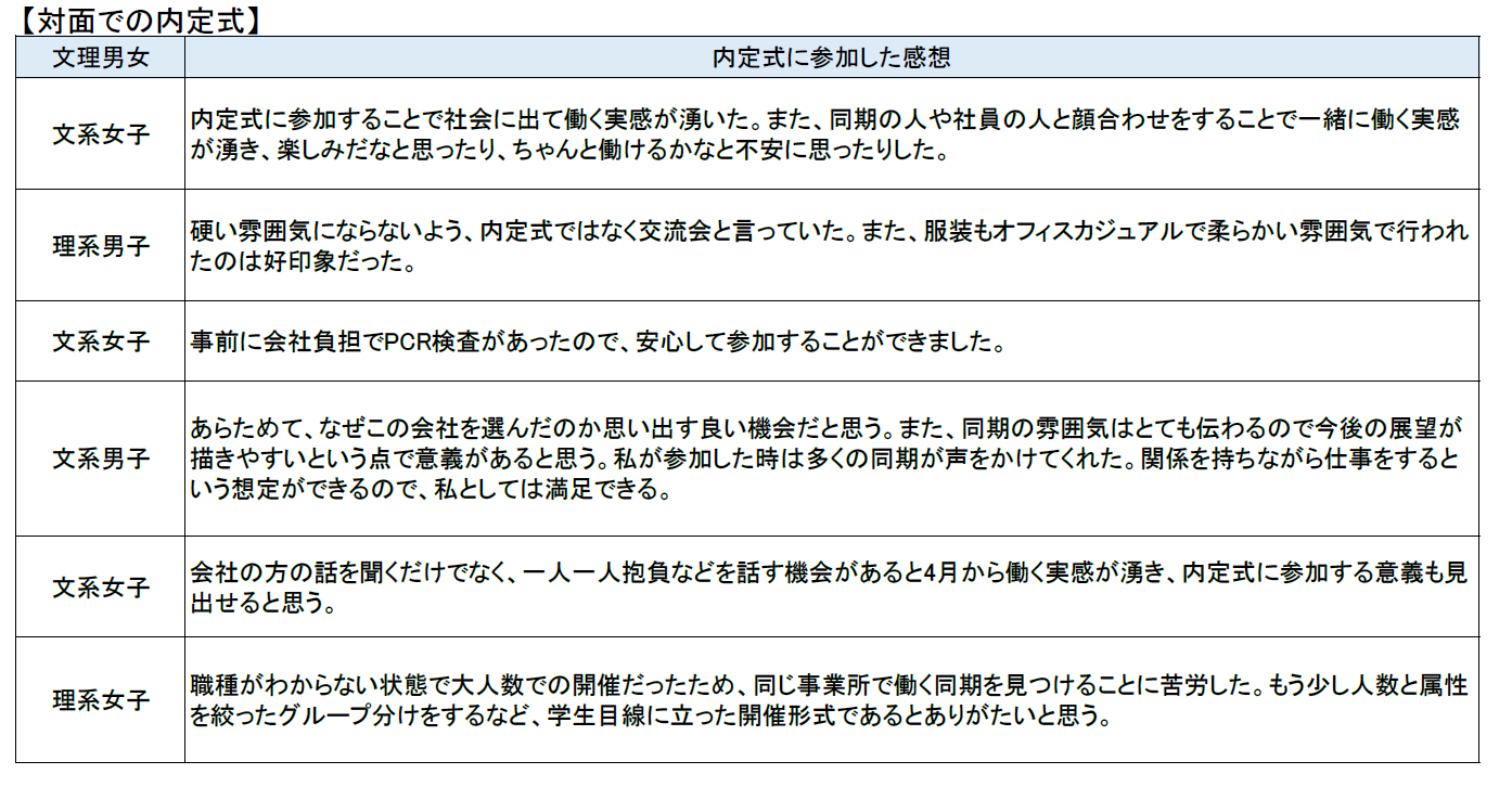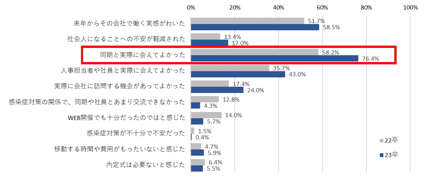 - 内定式に対面で参加した感想は「同期と実際に会えてよかった」が前年比18.2pt増の76.4%で大幅に増加。一方で「もっと同期や先輩との話し合いの場がほしい」などの声も【図5、6】