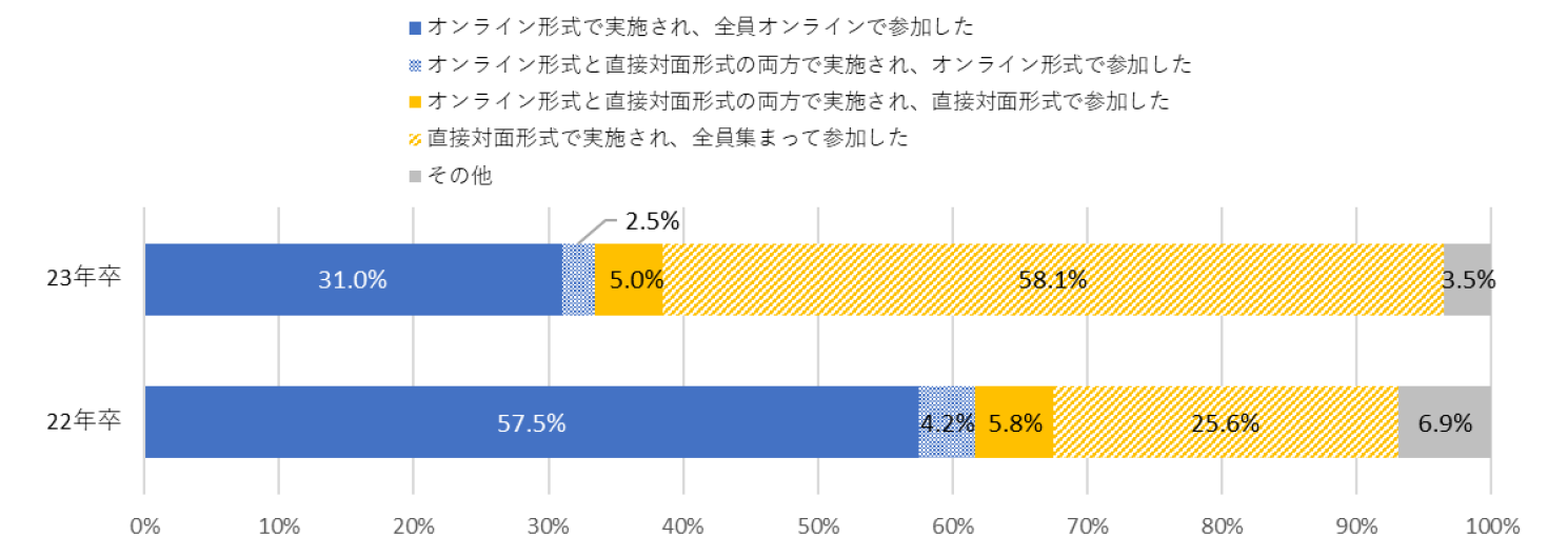 内定式の参加状況について「参加した」と回答した学生は81.2%で、前年の75.5%より5.7pt増加した。参加形式は「直接対面形式で実施され、全員集まって参加した」が58.1%で最多、一方で前年最多(57.5%)の「オンライン形式で実施され、全員オンラインで参加した」は31.0%と大幅に減少した。【図3、4】