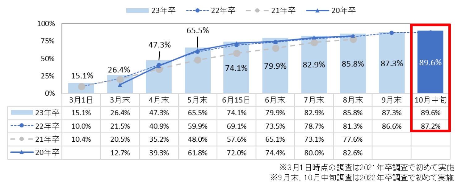 - 2023年卒業予定の大学生・大学院生の10月10日時点での内定率は前年比2.4pt増の89.6%【図1、2】