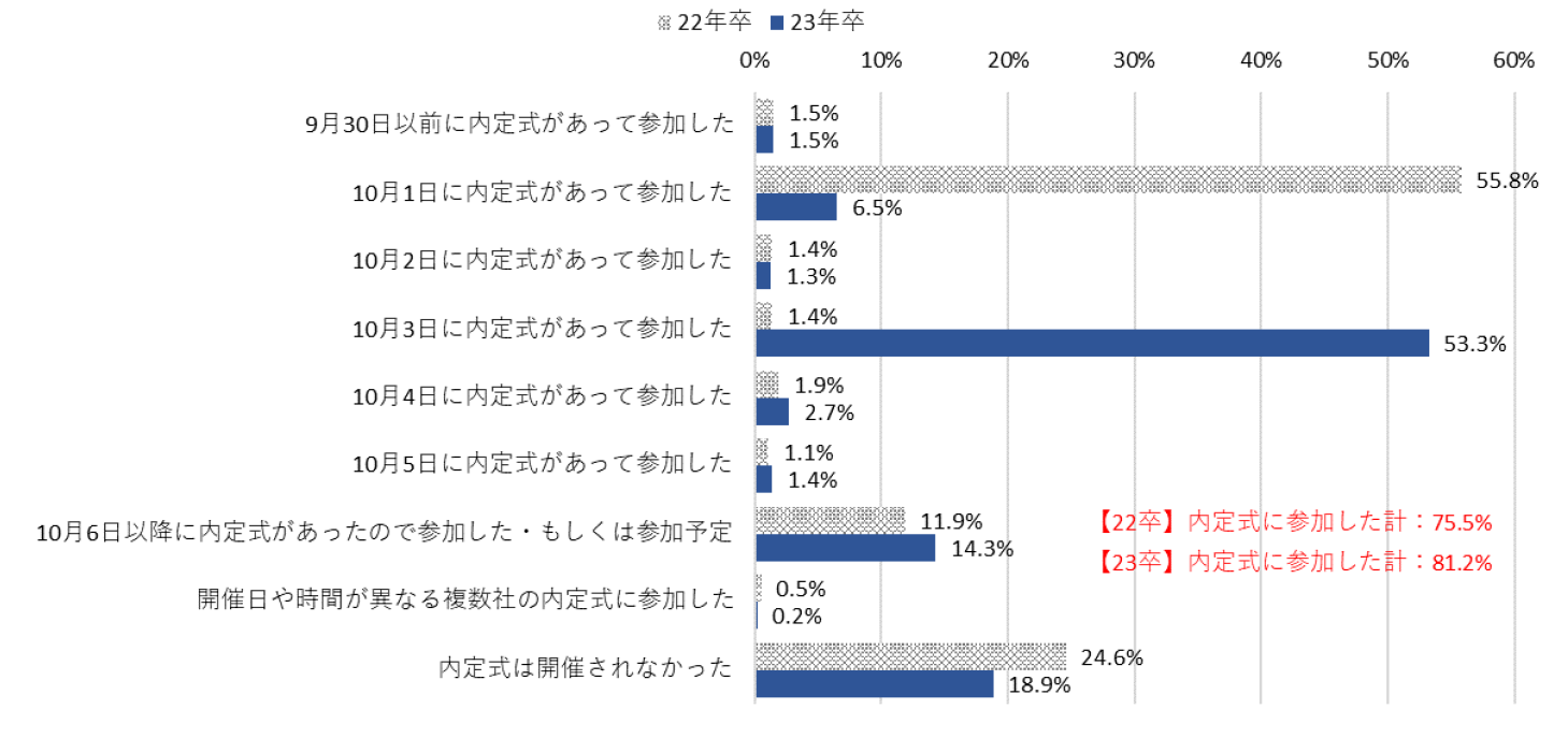 2023年卒業予定の大学生・大学院生の10月10日時点での内定率は前年比2.4pt増の89.6%。内定式に対面で参加し「同期と実際に会えてよかった」と回答した学生は76.4%で前年より大幅に増加