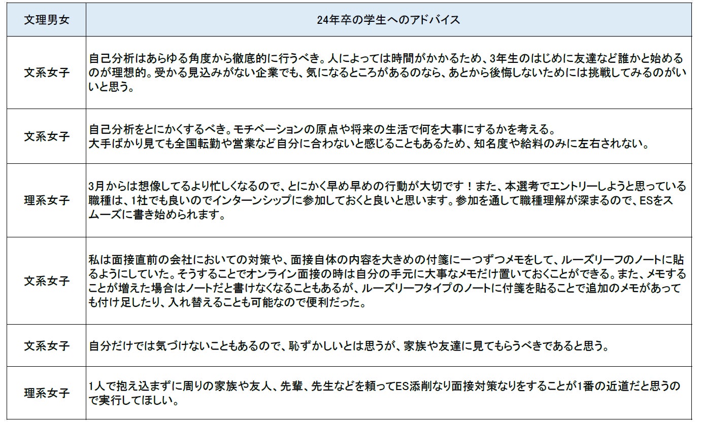 - 2024年卒の大学生に向けたメッセージやアドバイスは「自己分析を徹底的に」「早めの行動」「面接練習にも参加を」「人に頼ることも大事」【図7】