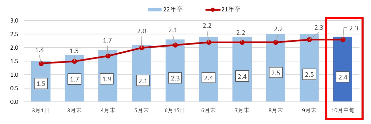 2023年卒業予定の大学生・大学院生の10月10日時点での内定率は前年比2.4pt増の89.6%、平均内定保有社数は前年比0.1社増の2.4社だった。23年卒の本調査は採用広報解禁後の3月1日調査から内定式実施後の10月中旬調査まで毎月実施しているが、企業の採用意欲の高まりを受けたことも影響し、すべての月で内定率・平均内定保有社数ともに前年比増で推移する結果となった。【図1、2】