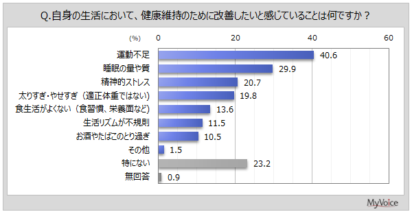 健康維持のために改善したいことは(複数回答)、「運動不足」が40.6%、「睡眠の量や質」が29.9%、「精神的ストレス」「太りすぎ・やせすぎ」が2割前後です。