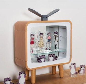 昭和レトロなミニテレビ風のラックの中に、推しのアクリルスタンドやぬいぐるみを入れるとまるで“推しが自分のテレビ番組に出演している”ような演出に!