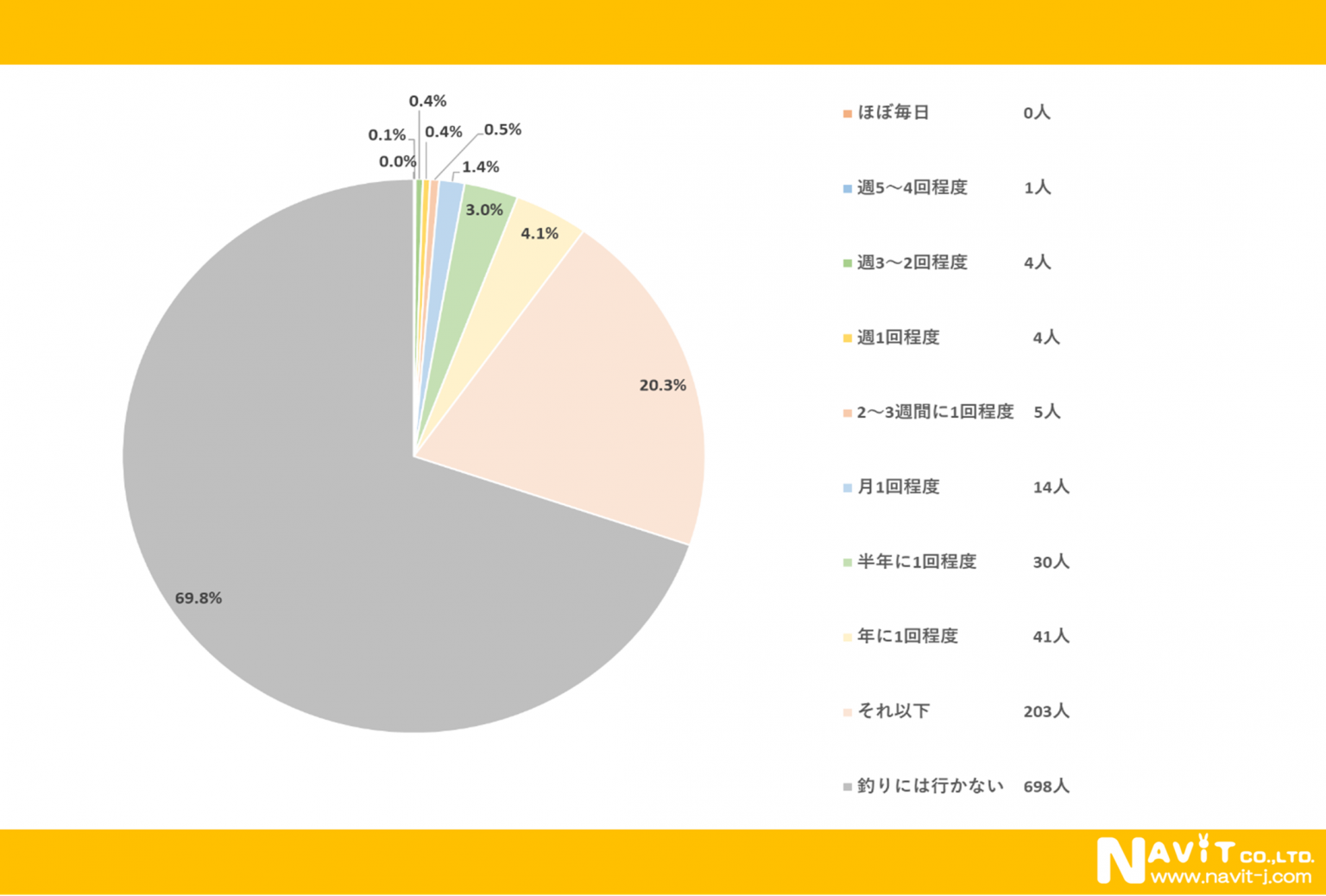 「釣りはどのくらいの頻度で行きますか?」という質問については、行くと回答した方は少なく、月に1回程度以上釣りに行く方は2.8%という結果となりました。「釣りには行かない」と回答した方が69.8%と、7割近い方は釣りには行かないようです。