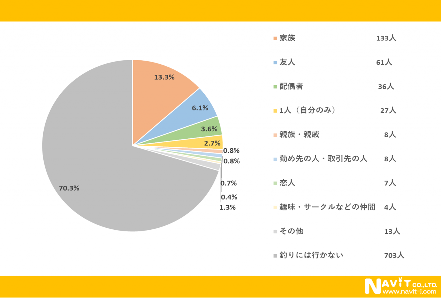 「釣りは誰と行くことが多いですか?」という質問については、「家族」が13.3%、「友人」が6.1%、「配偶者」が3.6%という順になりました。釣りは、家族と楽しんでいる方が多いようですね。
