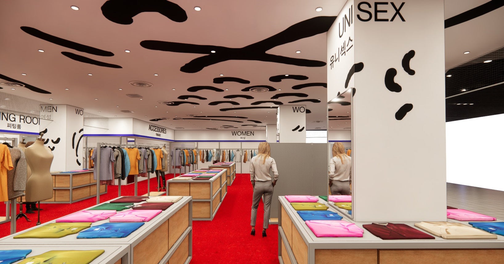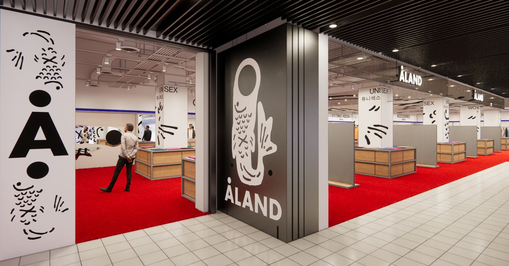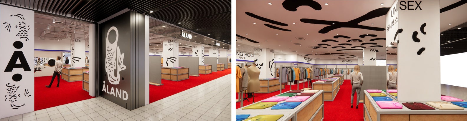 店舗デザインは、本場韓国のALANDの店舗を手がけたデザイナーが、“韓国のALANDの観点から創り上げた日本の雑貨店”をイメージし、赤を貴重とした内装となっています。天井や柱にはブランドシンボルのフィッシュが水墨画タッチで悠然と描かれ、商品棚からは趣ある木の質感が漂うなど、“和”を感じる雰囲気の中でお買い物を楽しんでいただけるようにデザインされています。