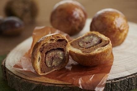 丹波栗の渋皮煮と金時芋のフィリングを、バターの風味豊かなパイ生地で包んでまんまるに焼き上げました。ほっくりした丹波栗とサクサクのパイのおいしさをお楽しみください。
