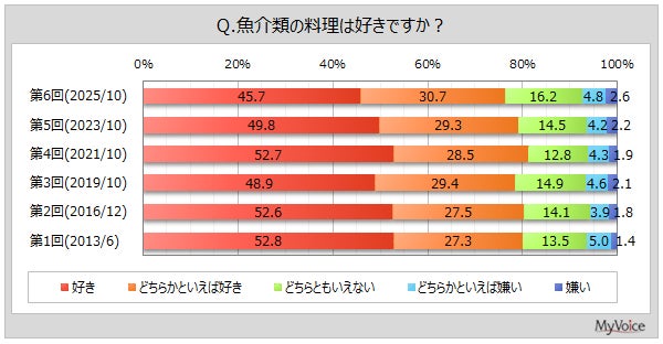 ■魚介類の料理が「好き」と回答した人は約46%、調査開始以来最低値