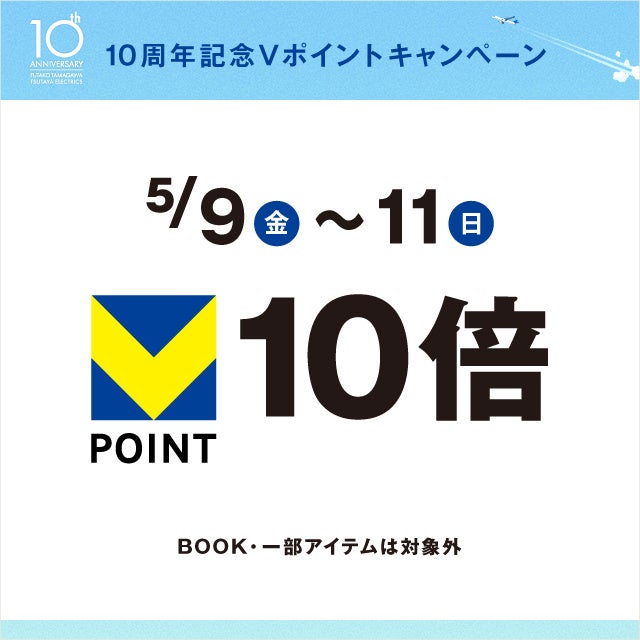10周年を記念し、日頃の感謝を込めてVポイント10倍キャンペーンを開催! 5月9日(金)~11日(日)の期間中、二子玉川 蔦屋家電内のキャンペーン対象店舗でお買い物いただくと、通常税込220円で1ポイント貯まるVポイントが、10倍の10ポイント貯まります。通常キャンペーンよりお得なこの機会に、ぜひご利用ください。