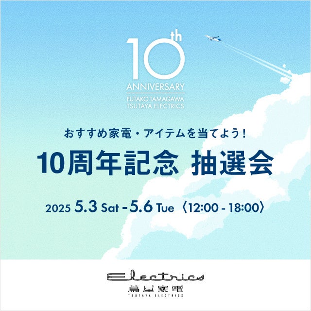 10周年を記念して抽選会を開催します。10周年の感謝の気持ちを込めて、10種のプレゼントをご用意しました。二子玉川 蔦屋家電で5,000円(税込)以上お買い物をして、おすすめ家電・アイテムを当てよう!