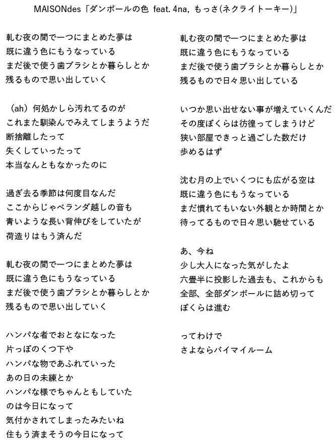 ・楽曲タイトル:MAISONdes「ダンボールの色 feat. 4na, もっさ(ネクライトーキー)」