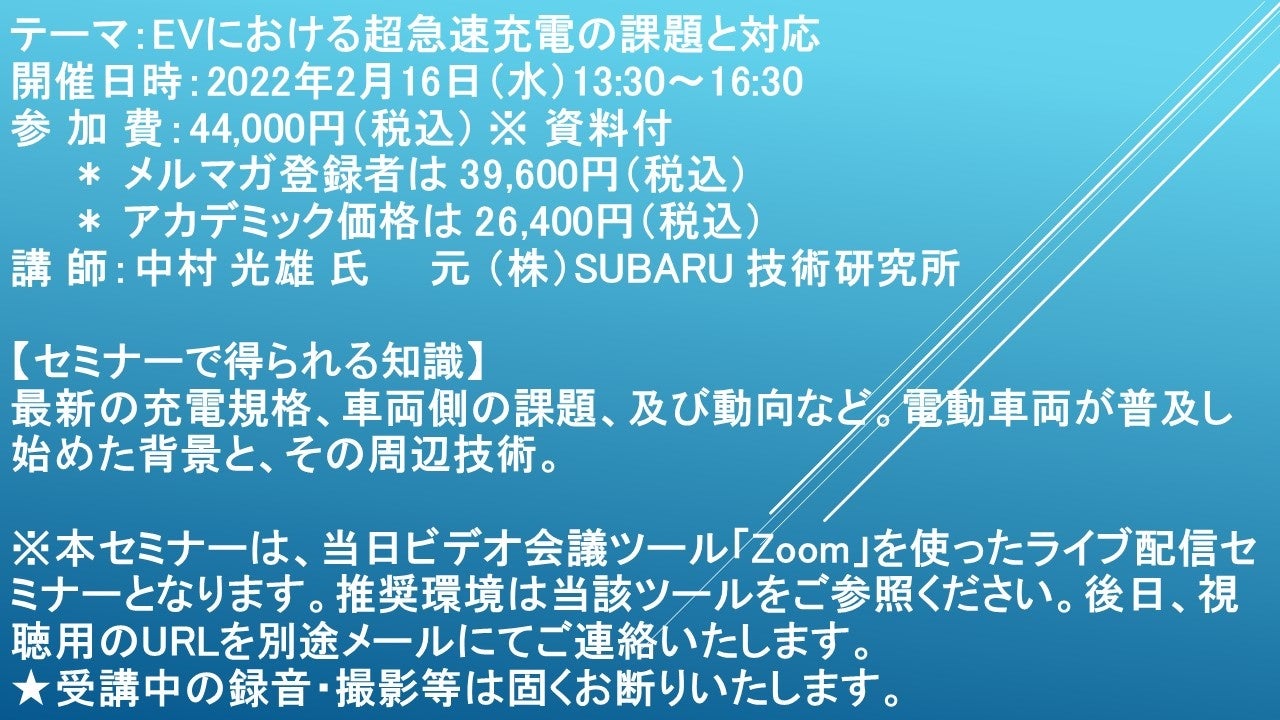 先端技術情報や市場情報を提供している(株)シーエムシー・リサーチ(千代田区神田錦町: https://cmcre.com/ )では、 各種材料・化学品などの市場動向・技術動向のセミナーや書籍発行を行っておりますが、 このたび「EVにおける超急速充電の課題と対応」と題するセミナーを、 講師に中村 光雄 氏 元 (株)SUBARU 技術研究所)をお迎えし、2022年2月16日(水)13:30より、 ZOOMを利用したライブ配信で開催いたします。 受講料は、 一般:44,000円(税込)、 弊社メルマガ会員:39,600円(税込)、 アカデミック価格は26,400円(税込)となっております(資料付)。