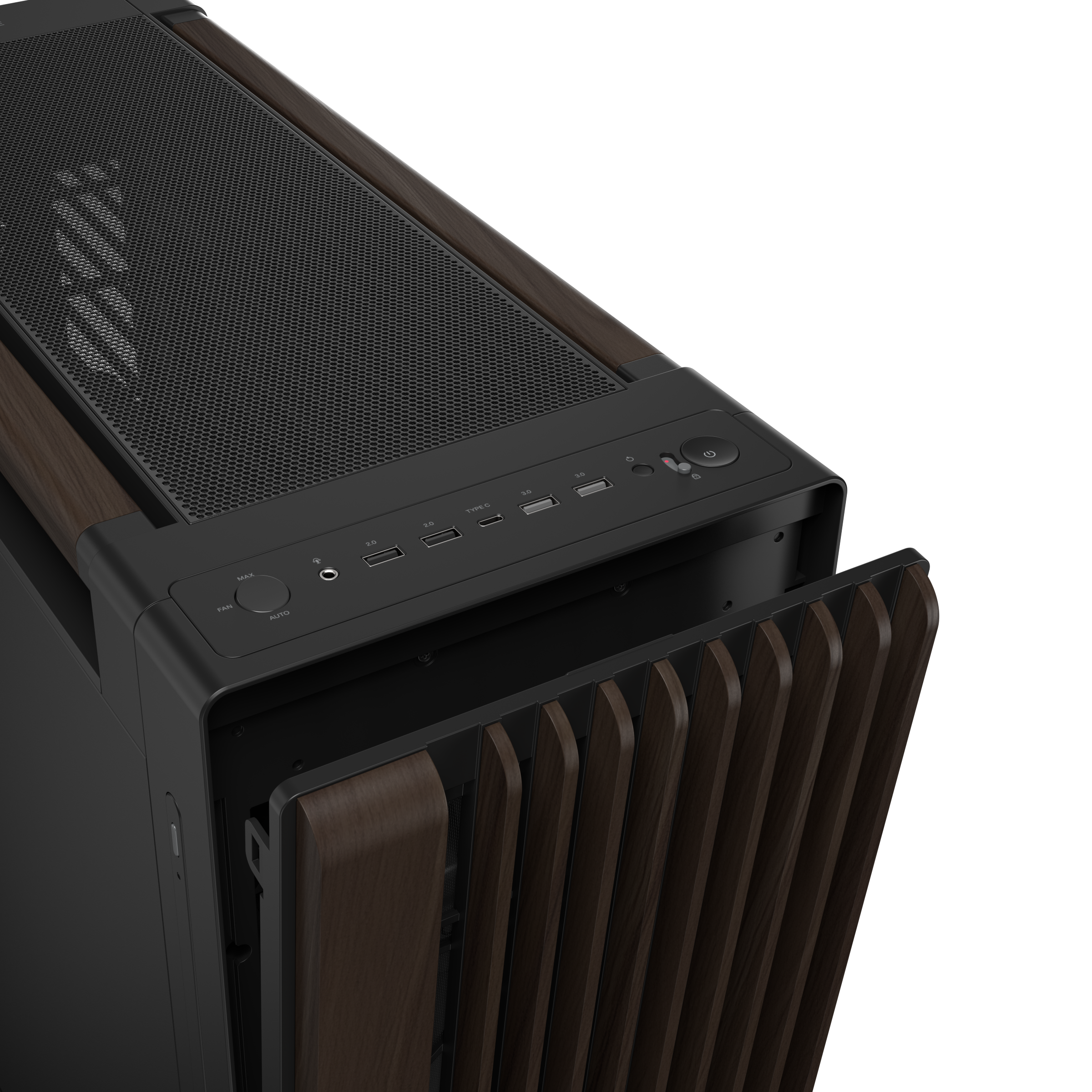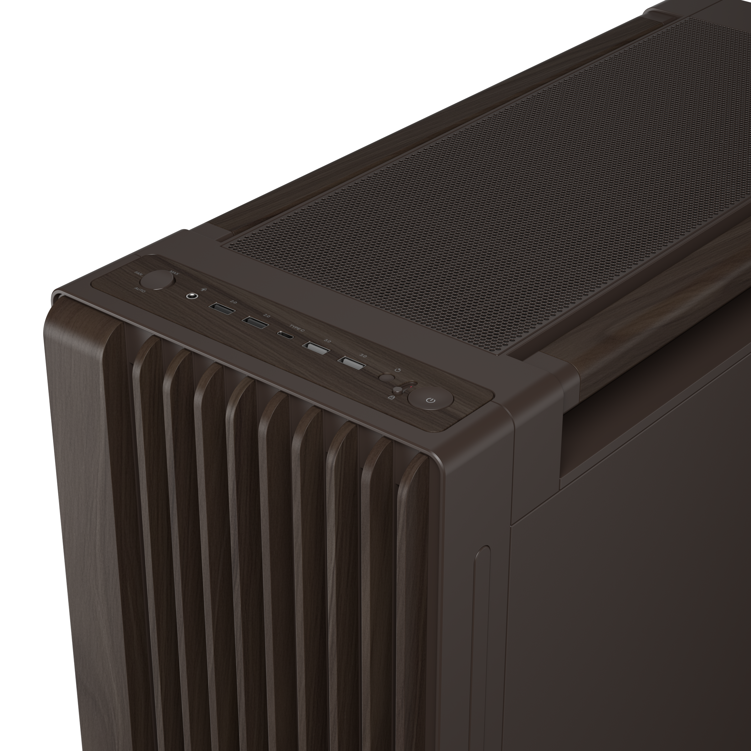 FSC認証のウォールナット材:高級感のある木目を持つウォールナット材を特別に選定し製造プロセスを施し美しい光沢と独特の色合いに仕上げました、フロントパネル、フロントI/Oパネル部、ハンドルに採用しハイテクと自然の美しさを見事に融合しています。
