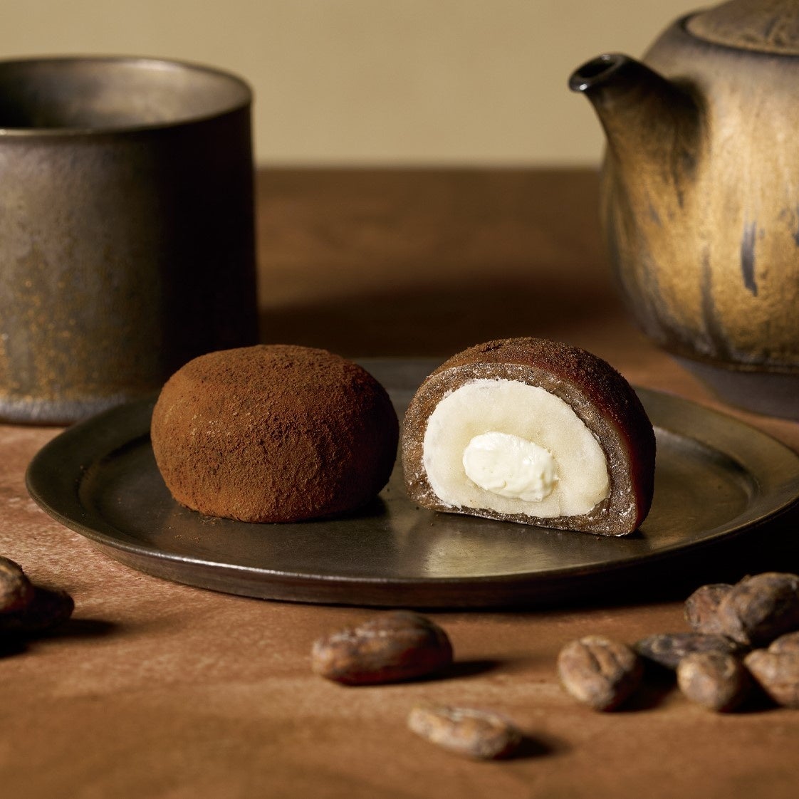 白餡の中にバタークリームを入れ込み、ココアパウダー入りの柔らかな羽二重餅で包んだ大福。ココアパウダーのビターな味わいがバタークリームのコクを引き立てます。