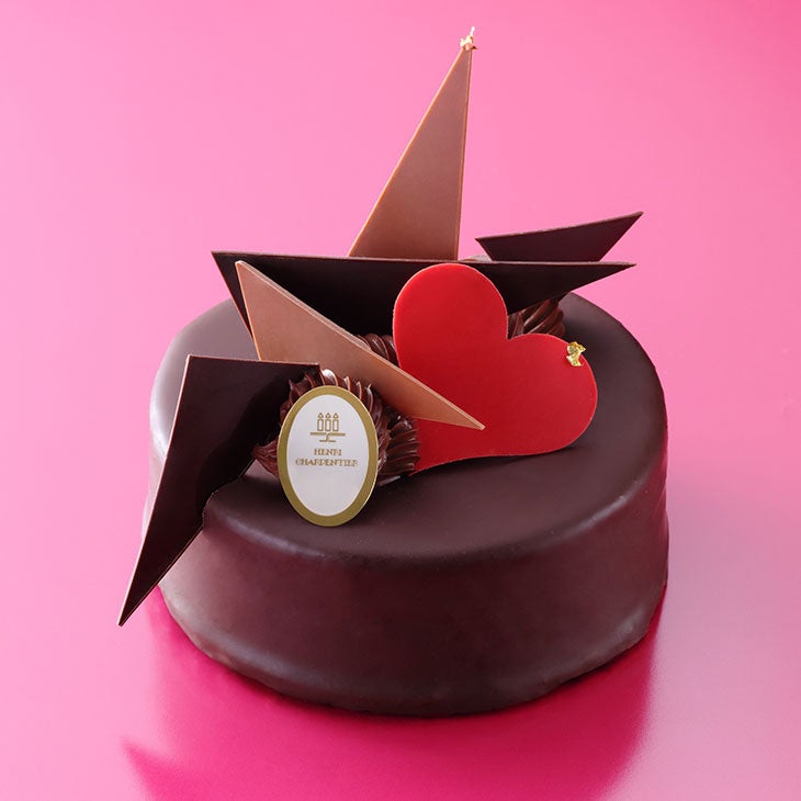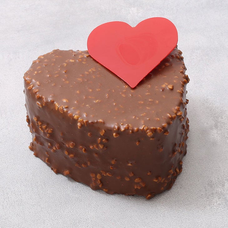 ふんわりととろける口どけのチョコレートクリームを、しっとりした食感のビスキュイ パン・ド・ジェーヌに合わせて。トップにはバレンタイン気分を盛りあげる赤いハートのデコレーションを添えました。
