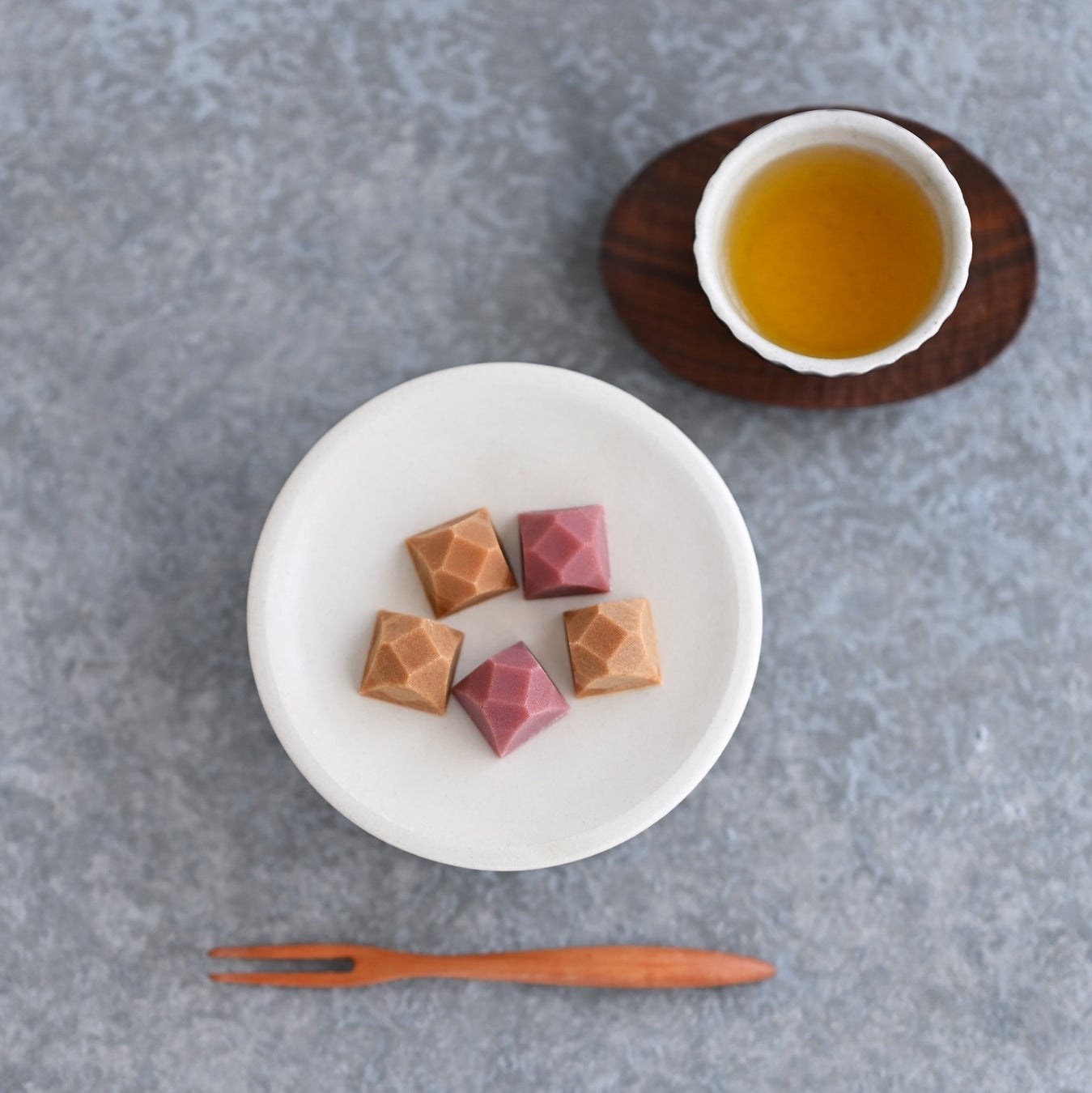 琥珀糖にルビーチョコレートとブロンドチョコレートを合わせた、新食感のチョコレート和菓子。