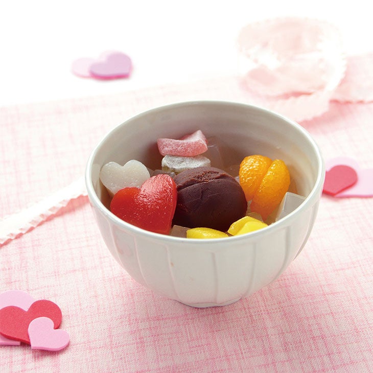 香り豊かなチョコレート餡やハート型の苺寒天、くず餅、みかんを添え、可愛らしく仕上げました。