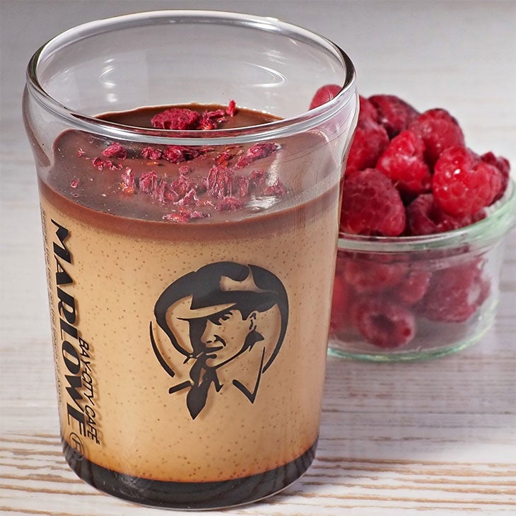 ビターチョコレート、キャラメルシロップ、アーモンドペーストを使用したプリン生地の上に、甘酸っぱい木苺ソースと滑らかな生チョコレートをのせています。