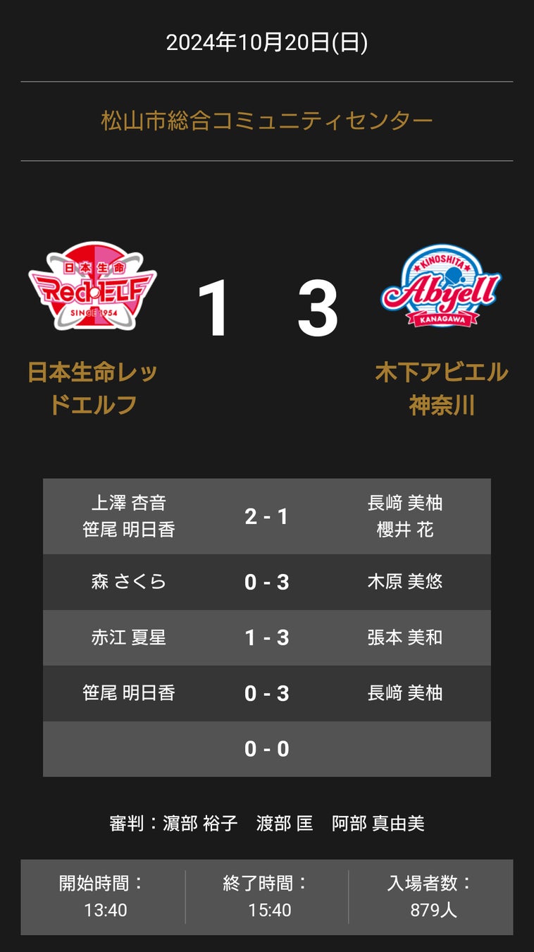 ノジマTリーグ 2024-2025 公式戦 10月20日開催 日本生命レッドエルフ vs 木下アビエル神奈川 試合結果