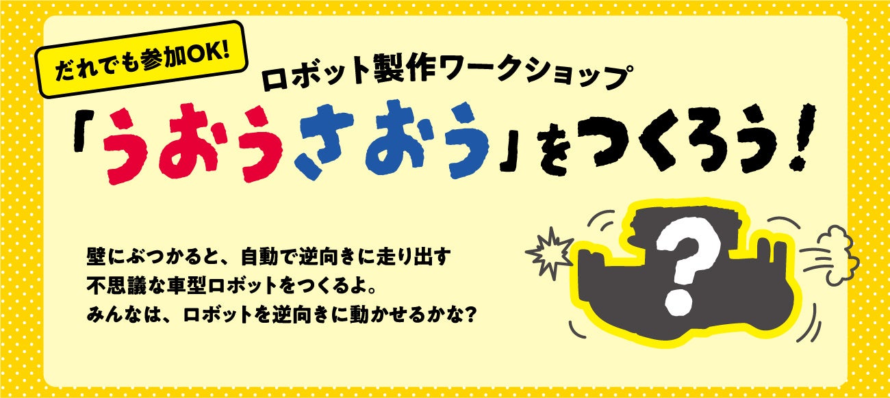 ロボット製作ワークショップ「うおうさおう」をつくろう!も館内で同時開催します。壁にぶつかると、自動で逆向きに走り出す不思議な車型ロボットをつくって、レースにチャレンジします。