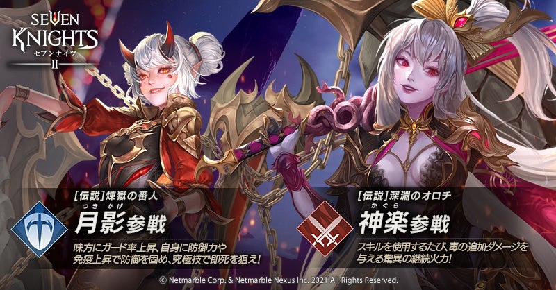 『セブンナイツ2』の世界に新たな伝説英雄として「深淵のオロチ 神楽(CV.ゆかな)」と「煉獄の番人 月影(CV.中野 さいま)」が参戦いたします。