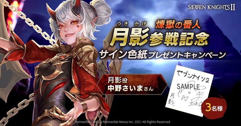 キャンペーン期間中に、『セブンナイツ2』公式Twitter(https://twitter.com/Sena2_JP)をフォローのうえ、キャンペーンツイートをリツイートしていただいた方の中から抽選で3名様に、中野さいまさんの直筆サイン色紙をプレゼントいたします。
