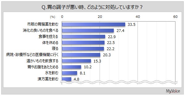 胃の調子が悪い時の対処法は(複数回答)、「市販の胃腸薬を飲む」が33.5%、「消化の良いものを食べる」「食事を控える」「体を休める」「寝る」「病院・診療所などの医療機関に行く」が各20%台です。