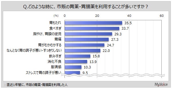 直近1年間に胃腸薬を利用した人の利用場面は(複数回答)、「胃もたれ」が35.5%、「食べすぎ」が33.7%、「胸やけ、胃酸の逆流」「胃痛」が各3割弱です。