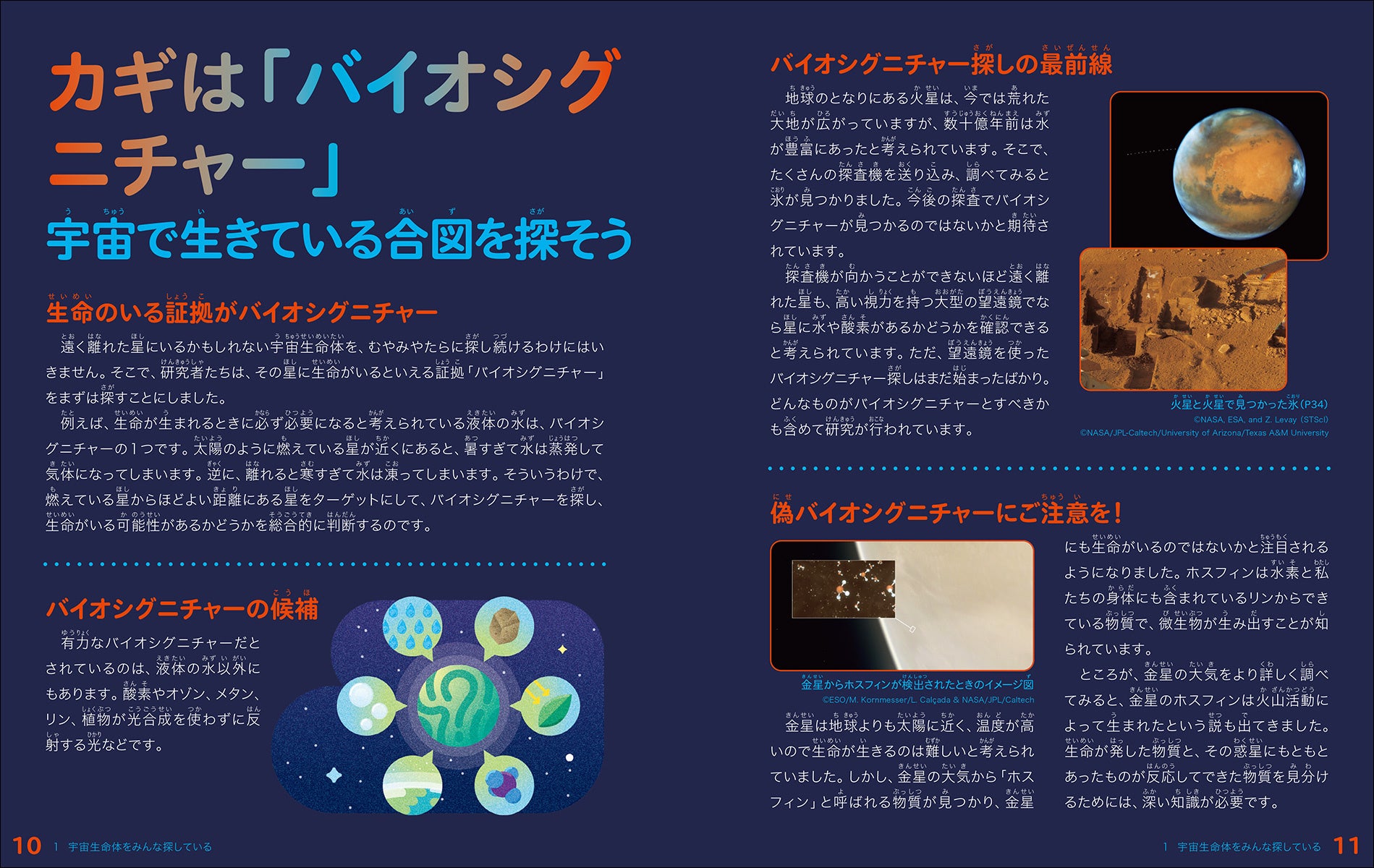 他にも、宇宙生命体に迫る「アストロバイオロジー」という学問についてや、宇宙生命体を探す証拠となる「バイオシグニチャー」とはなにか? 宇宙人がいるかを求める式がある? 系外惑星をどうやって見つけるか……など、ちょっと高度なギモンまで、たっぷりわかりやすく紹介しています。