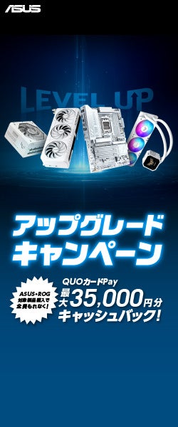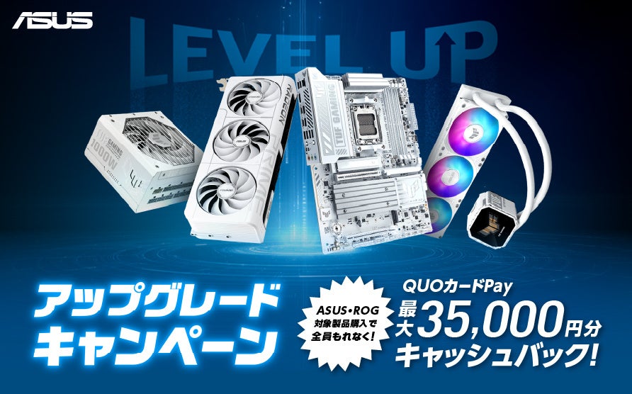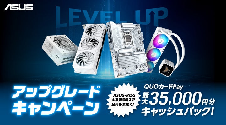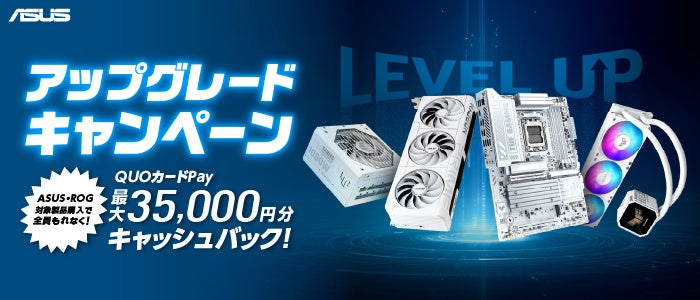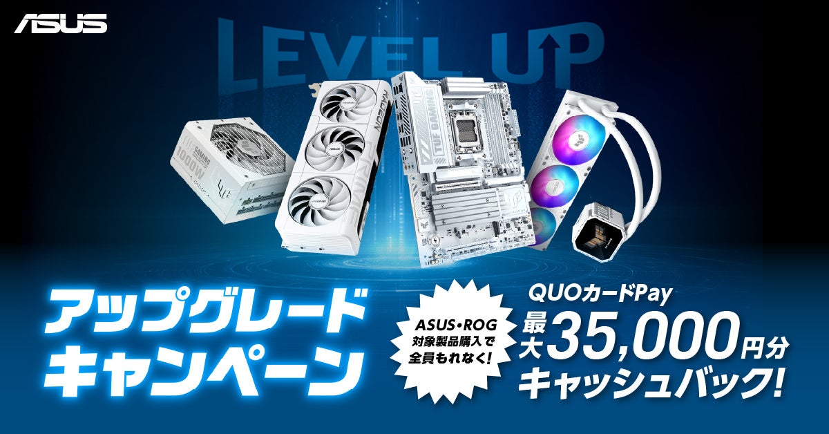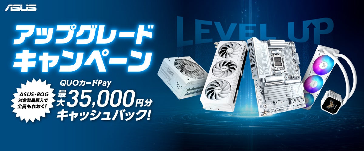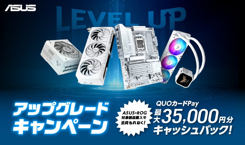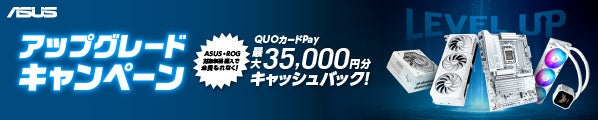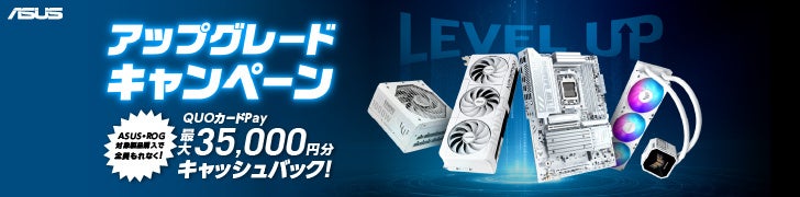 ASUS JAPAN株式会社は、自作パソコンのアップグレードや新規組み立てを検討されている皆様を強力にバックアップするため、ASUS・ROG対象製品をご購入され、応募内容を満たした方全員にQUOカードPayがもらえる「アップグレードキャンペーン」を3月30日より開催いたします。ビデオカード、マザーボード、PCケース、電源、クーラーの対象製品を購入し、応募する事で最大35,000円分のQUOカードPayをプレゼントいたします。