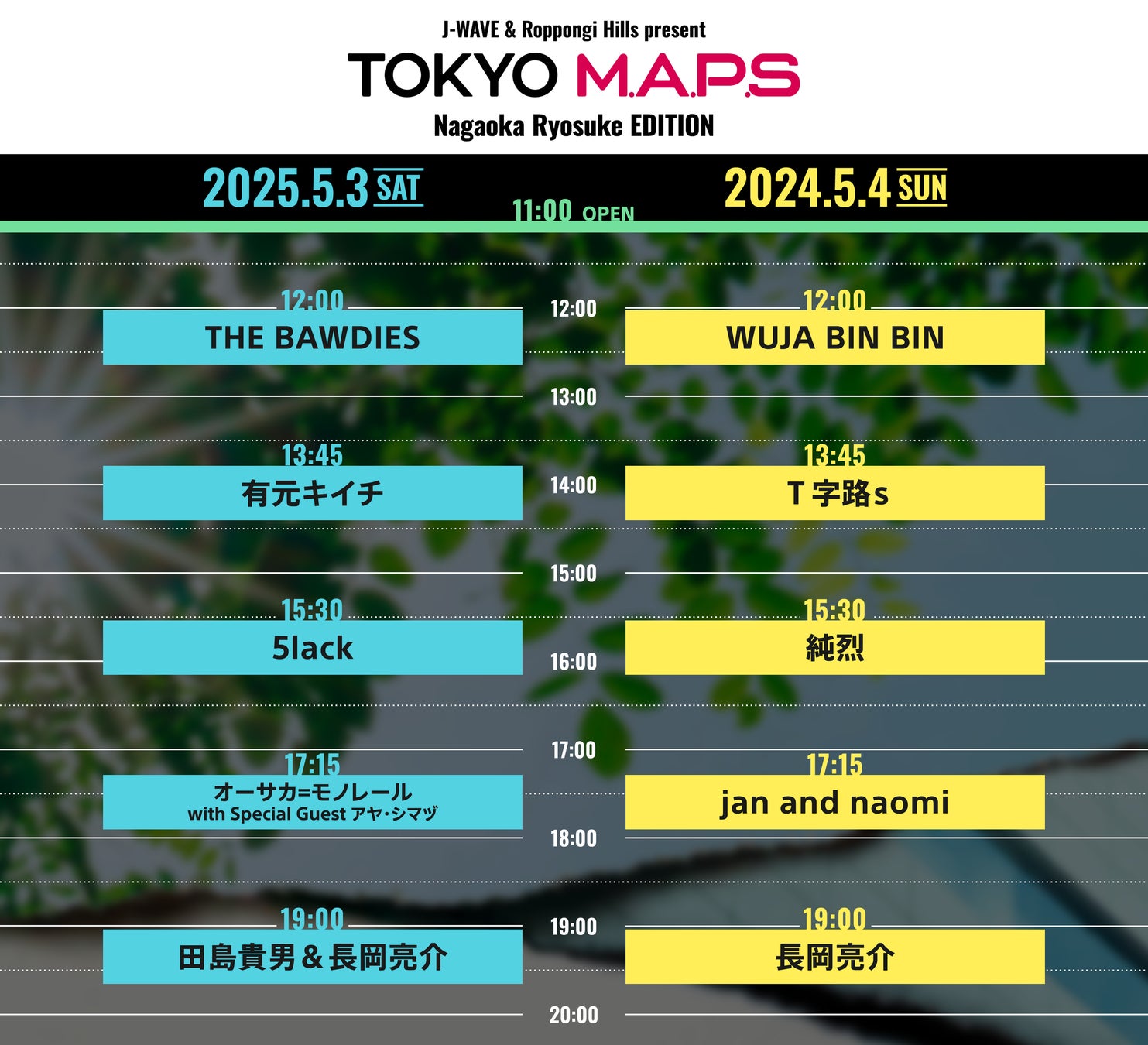ラジオ局J-WAVE(81.3FM)は、ゴールデンウィークの5月3日(土)、4日(日)の2日間、六本木ヒルズと共催でフリーライブイベント「J-WAVE & Roppongi Hills present TOKYO M.A.P.S Nagaoka Ryosuke EDITION」を六本木ヒルズアリーナで開催いたします。