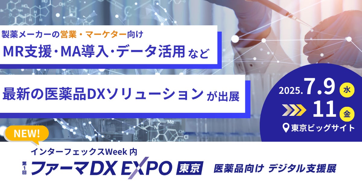 RX Japan株式会社は、2025年7月9日(水)~11日(金)の3日間、東京ビッグサイトにて「ファーマDX EXPO 東京(インターフェックスWeek内)」を開催します。本展示会は、医薬品業界における研究開発、製造~営業、マーケティング、流通など、あらゆるプロセスのDX(デジタルトランスフォーメーション)を加速させる製品・サービスが一堂に集結する国内最大級の展示会です。