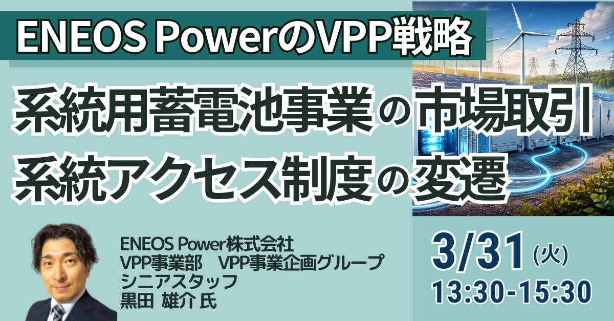 【JPIセミナー】「系統用蓄電池事業の市場取引・系統アクセス制度の変遷とENEOS Power(株)のVPP戦略」3月31日(火)開催