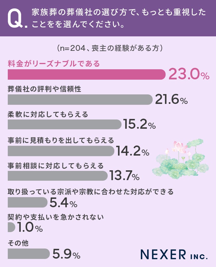 また家族葬には「2親等の親族(兄弟姉妹・祖父母・孫)」まで呼ぶべきだという声がもっとも多く、家族葬の葬儀社の選び方は料金のリーズナブルさがもっとも重視されていました。