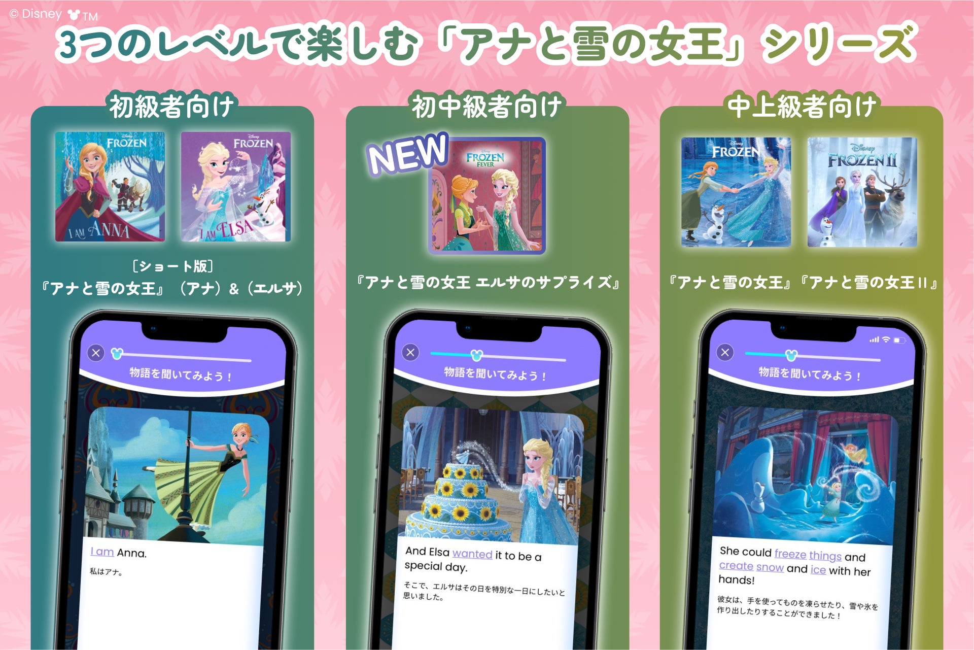 『アナと雪の女王 エルサのサプライズ』のリリースで、「アナと雪の女王」シリーズの作品は計5作品に。初級から中上級まで、3つのレベルで学べる学習コンテンツをそろえています。